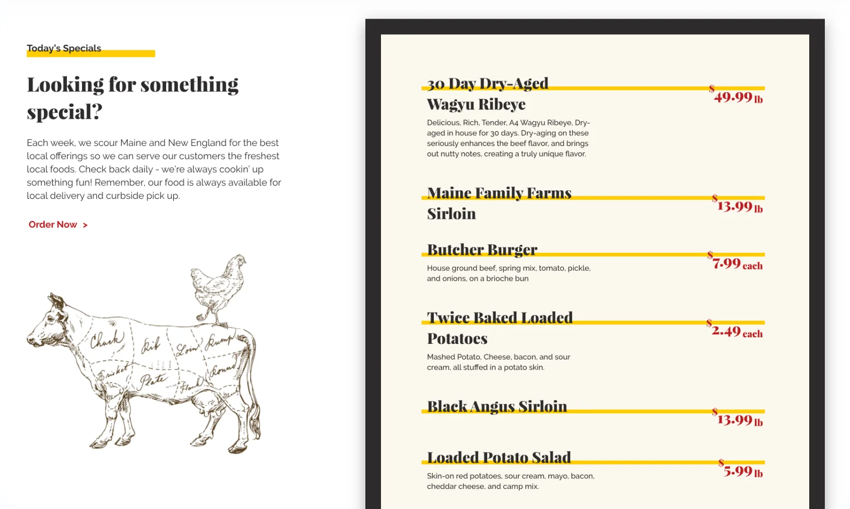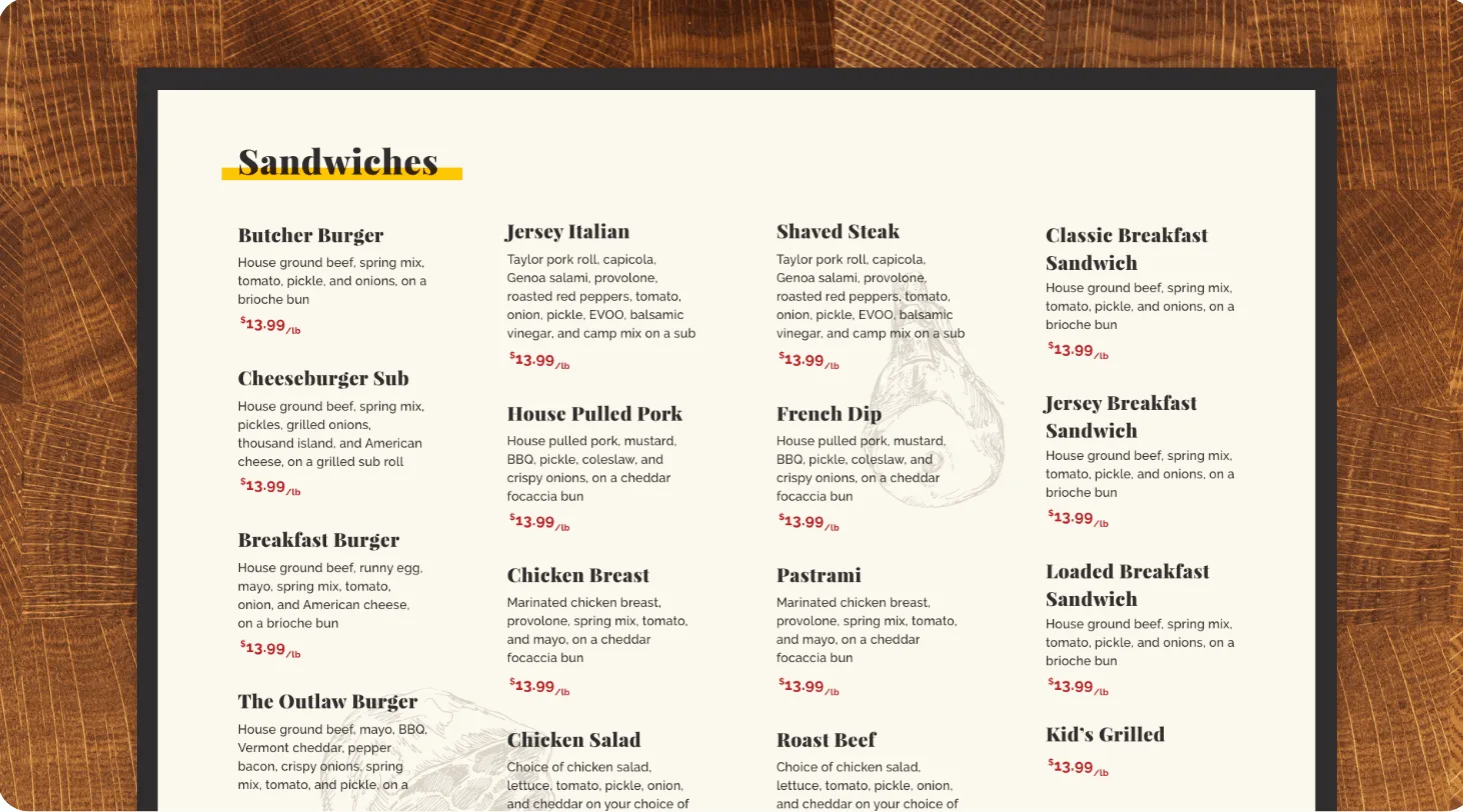 An important part of Great East Butcher’s web design were their menus. They have multiple — one for each category of their business: the deli, the butchershop, the market, plus a series of specialty menus. We spent a great deal of time during the discovery phase of the project creating an organized and streamlined user experience that would make each menu easily accessible and understandable. Each individual menu item links to the site’s online store.