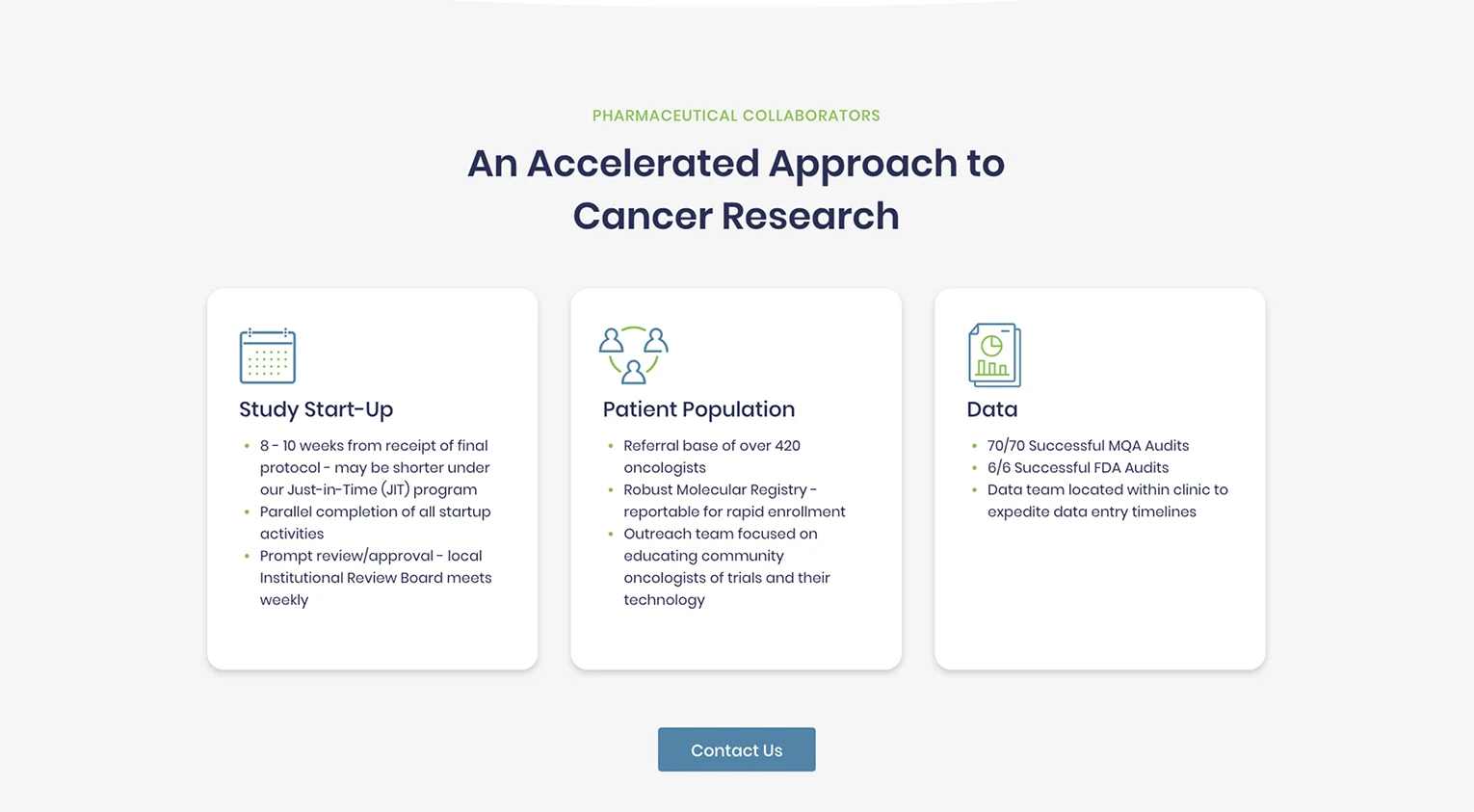 The Pharmaceutical Collaborators section gives visitors insight into Mary Crowley’s methods and approach to cancer research by highlighting the various moving parts that come together to create a successful clinical trial.