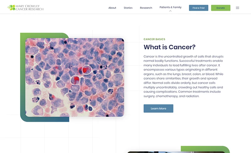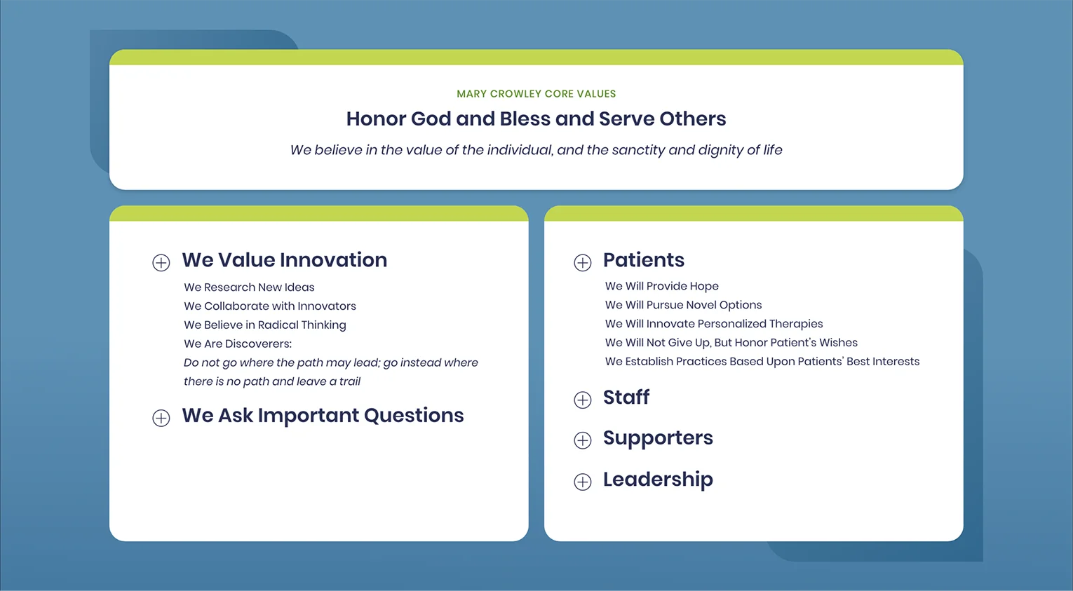 The About Us page offers visitors a window into Mary Crowley’s approach and methods for cancer research as well as a comprehensive understanding of their mission and values.