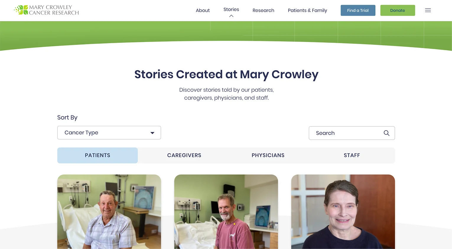 The Stories Page is a dedicated space for users to read and be uplifted by the stories and experiences shared by Mary Crowley patients, caregivers, physicians, and staff.