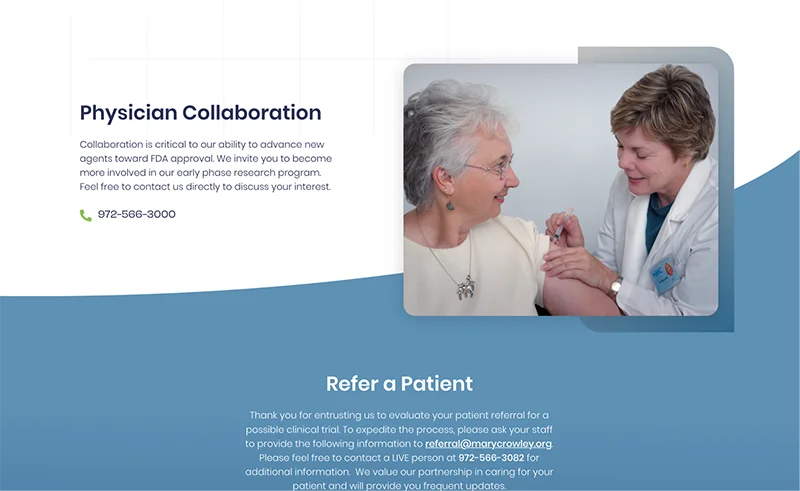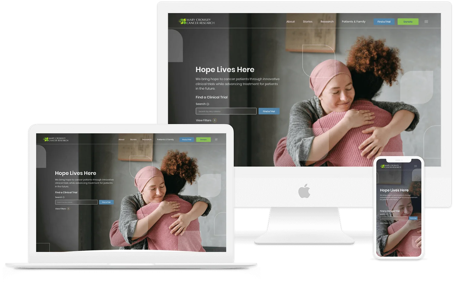 We designed the hero to feature uplifting imagery along with a Clinical Trial search bar with filters to get visitors started and confident on their journey with Mary Crowley.