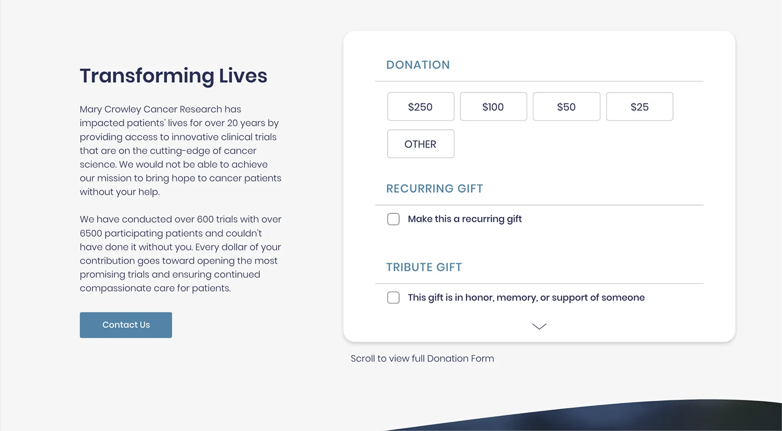 We built out an interactable History Timeline to explain Mary Crowley’s 20 year history to give visitors a better understanding of how they got started and the progress they’ve made since.