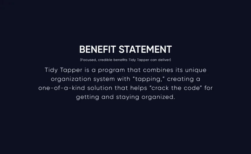 Another important part of the branding process was the messaging framework. We always start this process by identifying the client’s Key Features, or the things that set them apart and make them unique. From there, we take those Key Features and boil them down further into a Benefit Statement – a 1-2 sentence description of the benefits they provide to their customers. Next, we create a Value Proposition, which is often used as the company’s tagline. Bettina chose the “Tap into a Tidy Life!”